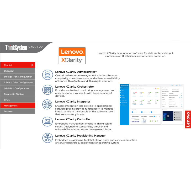Lenovo delivers engineered, tested and certified IT solutions that are high performance, scalable and cost-effective. By combining industry-leading x86 server technology and reliability, partnering to deliver best-in class co-innovation and providing end-to-end peace of mind with Lenovo ThinkShield, XClarity, and Services, Lenovo solutions enable customers to use real-time data to drive actionable insights. As the compute for these solutions, ThinkSystem SR650 V2 makes businesses smarter by providing support for data analytics, hybrid cloud, hyperconverged infrastructure, video surveillance, high performance computing and much more.